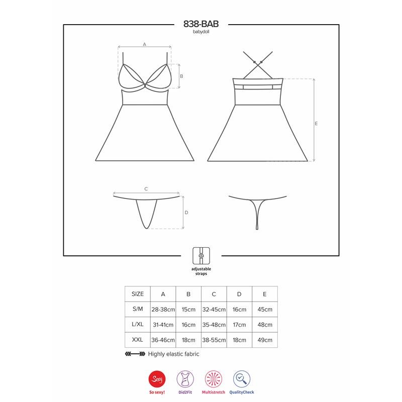 Playful black babydoll with a mix of patterns and patterns. The skirt part is in opaque black, the chest and waist part have a flower pattern and a series of straps that cross your chest and back. Thong included Composition: 90% polyamide, 10% elastane Available sizes: S / M and L / XL