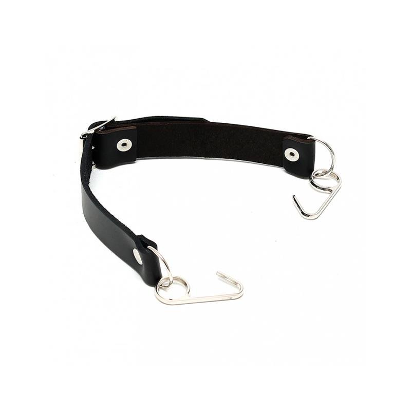 Gag with hooks that stretch the corners of the lips. It is adjustable with buckle on the back.Perfect to live BDSM nights without limit. Features: Material: Leather Color: Black AdjustableÂ