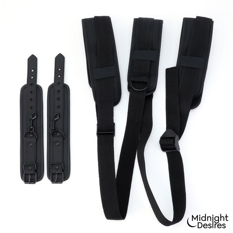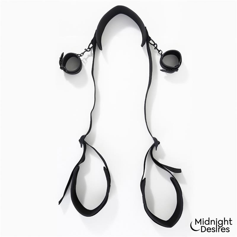 Let yourself go and embrace the thrill of submission with Midnight Desires. Feel the anticipation, enjoy the game of restraint, and the electrifying pleasure of surrender. With Midnight Desires, you’ll discover sensations you never imagined feeling, pushing you beyond your limits. Awaken that unknown side of yourself, surrender, obey, feel, enjoy. If you want to try new positions with your partner, what could be better than a good restraint set? This restraint set includes wrist cuffs and restraints for the neck and thighs. This is ideal for trying new positions and experiencing new emotions in a simple, comfortable, and satisfying way. The wrist cuffs are detachable, and the straps connecting both parts are fully adjustable so you can enjoy it to the fullest. Features: 100% vegan leather Fully adjustable Detachable and adjustable wrist cuffs with buckles
